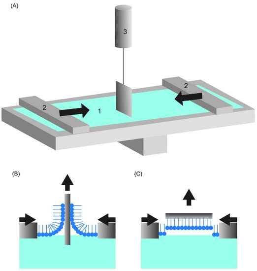 (A) Schematic of a Langmuir film balance setup with a Wilhelmy plate contact probe and two symmetrical barriers. (B) Vertical transfer of a film from a fluid interface to a solid substrate using the Langmuir–Blodgett method. (C) Horizontal transfer of a film from a fluid interface to a solid substrate using the Langmuir–Schaefer method. Reprinted with permission from Ref. [45]. 2020, Elsevier.