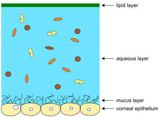 The tear film is a fluid layer that covers the corneal surface and protects the eyes from the environment. It has a heterogeneous structure that can be divided into three layers [85]. The innermost layer (mucus layer) is a gel-like mucin layer (2.5–5 µm thick), composed mainly of glycosylated proteins produced by epithelial cells. The role of this inner layer is to provide an easily wettable surface that contributes to the easy re-distribution of the tear film between blinks. The intermediate layer, which measures approximately 4 µm in thickness, comprises a diverse mixture of substances that encompass both water-soluble and water-insoluble components. This assortment includes electrolytes, proteins, peptides, small-molecule metabolites, and mucins [86,87]. The intermediate layer is characterized by its smooth surface, enabling light refraction. Furthermore, it serves multiple functions such as facilitating lubrication during blinking and eye movements, preventing ocular surface dehydration, offering protection against environmental pathogens and particles, and aiding in the nourishment of corneal cells [87]. The outermost layer of the tear film, known as the tear film lipid layer (TFLL), is the thinnest component, ranging in thickness from 0.015 μm to 0.160 μm, and is predominantly composed of lipid compounds [88]. The composition, structure, and function of the TFLL are still controversial, but it is generally accepted that its key role is related to the reduction of the interfacial tension of the tear film. In addition, its presence is of a paramount importance in ensuring tear film stability [89]. Figure 2 shows a sketch of the multilayered structure of the tear film.