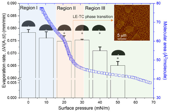 The dependence of the evaporation rate and the area per molecule of the lipid at the water/vapor interface are depicted as function of the surface pressure. The inset shows an AFM micrograph depicting the lateral organization of the lipid at the interface. Reprinted from Xu et al. [116].