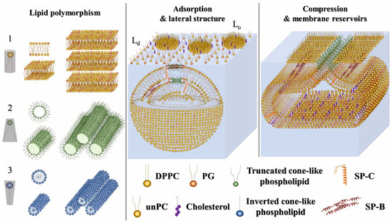 Lipid membranes have the ability to adopt various three-dimensional structures when immersed in aqueous environments, including both lamellar and non-lamellar configurations. The distinctive molecular properties of lipids, particularly their hydrophilic-lipophilic balance (HLB), play a critical role in the adsorption of lung surfactant (LS) at the liquid/gas interface and its reorganization during the respiratory process [126]. Figure 6 illustrates the different lipid structures that can manifest in LS under physiological conditions.