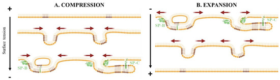 LS adsorption and spreading at the gas/liquid interface results in an interfacial film with significantly reduced interfacial tension during expiration, minimizing work of breathing [67]. To further reduce the interfacial tension during the exhalation phase, the composition of the interfacial film can be modified [157] by excluding molecules with lower capabilities for reducing interfacial tension (unsaturated phospholipids, cholesterol and surfactant proteins) while enriching the interface with DPPC. This creates solid structures under high lateral pressures that increase lung compliance and stabilize alveolar volume, preventing premature alveolar collapse during expiration [125,158,159]. The association of reservoirs of excluded lipids and proteins with the interface facilitates compositional remodeling during inspiration, adding new molecules to the LS film [39,156,160,161,162,163,164]. This structural interplay ensures an efficient minimization of interfacial tension, driven by desaturated lipids and supported by surface-active proteins (SP-B and SP-C).