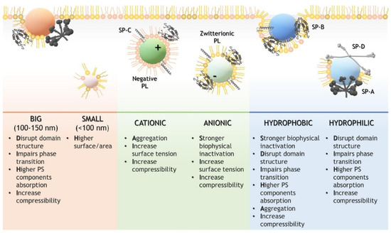 It is crucial to emphasize that particles typically affect respiratory function at two different levels: (i) The biological functionality of lung surfactant (LS); and (ii) The metabolism of LS [169]. Consequently, understanding the effects of particles on the physicochemical properties of LS layers requires a thorough investigation of the particular properties of the particles under study [36,188].