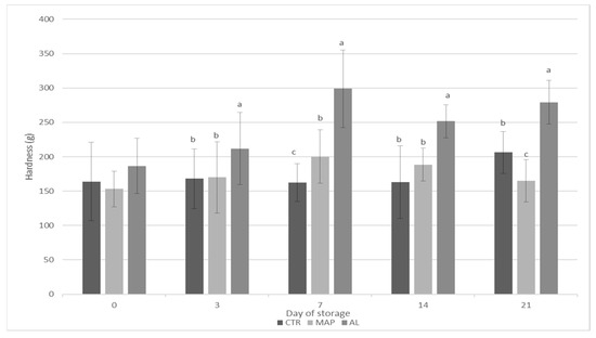 As illustrated in Figure 2, a general increase in hardening was observed in all samples during the storage time, whereas the samples showed significant differences. The coated segments (AL) possessed a higher firmness (279.3 g) than the MAP (164.9 g) and CTR (206.2 g). This trend was probably due to reactions that cause tissue breakdown or thickening.