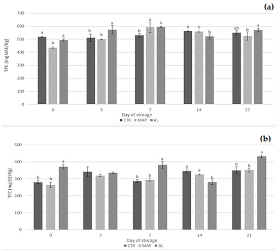 Total phenolic content (TPC) (a) and total flavonoid content (TFC) (b) in Clementine segments during storage. Different letters (a,b) show significant differences between the means of each group as assessed by Tukey’s post hoc test (p < 0.05).