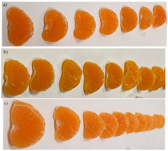 Previous studies have evaluated the influence of edible coatings on whole citrus fruits. Alvarez et al. [14] saw that pectin-based coatings enriched with eugenol preserved the chemical-physical characteristics of ‘Valencia’ oranges and reduced the incidence of sour rot caused by P. Italicum. Jurić et al. [15] noted that layer-by-layer hydroxypropyl methylcellulose/chitosan or single chitosan coating preserved the overall quality of mandarin fruit both at room and cold temperatures for 10 and 28 days, respectively. Rasouli et al. [16] evidenced that an edible coating based on Aloe vera gel and salicylic acid reduced electrolyte leakage, chilling injury, and malondialdehyde accumulation and preserved sensorial, textural, and microbiological characteristics of the orange ‘Thomson Navel.’ While edible coatings on whole citrus fruits have already been tested [14,15,16], no coating has yet been tested on segments of Clementine to produce ready-to-eat fruits. In addition, there are no studies concerning the packaging and storage of Clementine segments, so this research could be useful for disseminating new knowledge on equally new possibilities for technological proposals and the marketing of quality fruit.