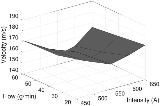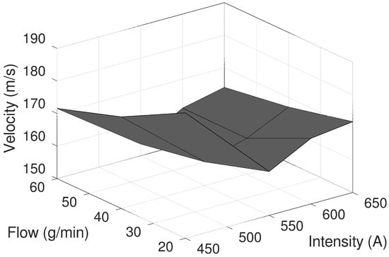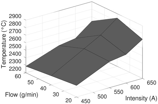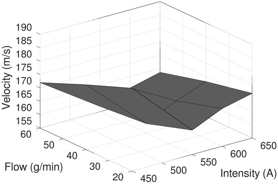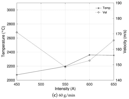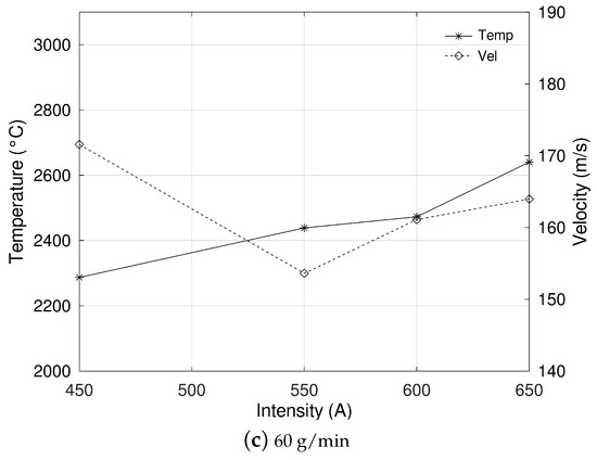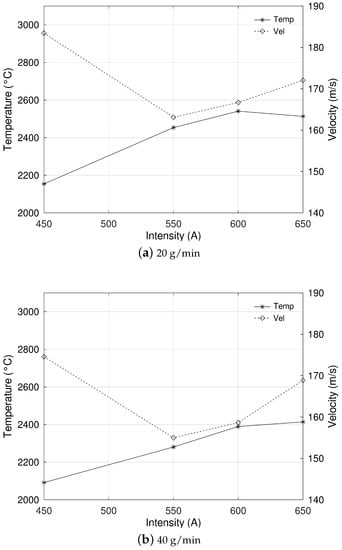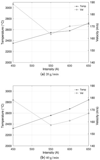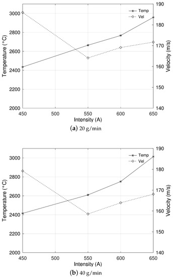 The experimental results confirmed the direct relationship between intensity and particle temperature, consistent with the relationship between intensity and energy generated in the arc in the spray device. The velocities followed a similar relationship.