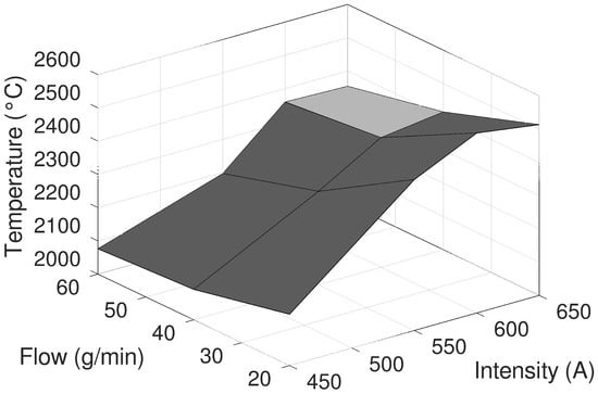 Figure 8 shows atypical results with respect to the rest, showing higher temperature values for a mass flow rate of 40 g/min. The flow value was 9.5 slpm. The trend was observed for all three intensity values, so accidental interference during the measurement should be ruled out. These results can be explained as follows. The particles penetrated less into the jet when the mass flow rate was small, as they had a lower velocity perpendicular to the jet. When the mass flow rate was sufficient to ensure that the particle penetrated the jet, its temperature increased. This explains the direct relationship between mass flow rate and temperature. For a given value of the mass flow rate, the penetration of the cold particle into the centre of the jet was ensured. If the flow rate increased further, the factor of how many cold particles tried to heat up became more important, and the relationship between mass flow rate and particle temperature became inverse. Therefore, the optimum from the point of view of particle temperature, the highest value, corresponded to an intermediate flow.
