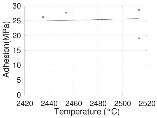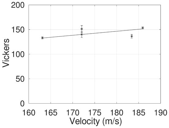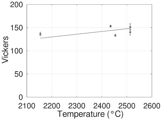 The regression line in Figure 13 shows an increase in hardness with the speed of the particle in flight. The regression line in Figure 14 also shows an increase in hardness with the temperature of the particle in flight. It should be noted that the maximum velocity does not coincide with the maximum temperature, so it was decided to study those parameters separately.