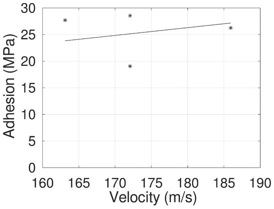 Relationship between coating adhesion and particle velocity: adhesion value (*).