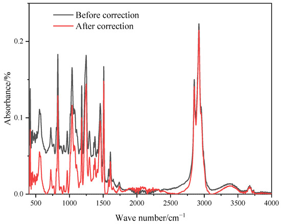 The FTIR test is capable of being used to monitor the variation in characteristic bands [33] in thermosets and therefore understand the curing process. Studies have also confirmed the comparability of the kinetics established via FTIR to other methods [34,35,36]. In this study, a Nicolet iS10 infrared spectrometer in attenuated total absorbance mode from the Thermo Scientific Corporation (Shanghai, China) was utilized to monitor the curing process. The scanning range was from 400 to 4000 cm−1 with a spectral resolution of 4 cm−1. Before calculating the characteristic peak areas, baseline corrections were conducted, and the spectra after baseline correction are demonstrated in Figure 2.
