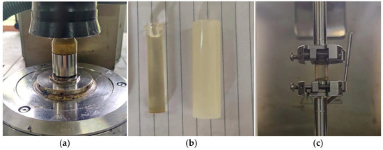 To prepare such a sample, the homogenous STR mixture was poured into a cylindrical silicone tube with an inner diameter of 8 mm, as shown in Figure 3b. After the designed curing process, the STR sample was extracted and truncated with a height of 20 mm. Then, steel rings were glued to both ends of the STR cylinder. Finally, the STR sample was clamped on the fixture for the following tests, as shown in Figure 3c.