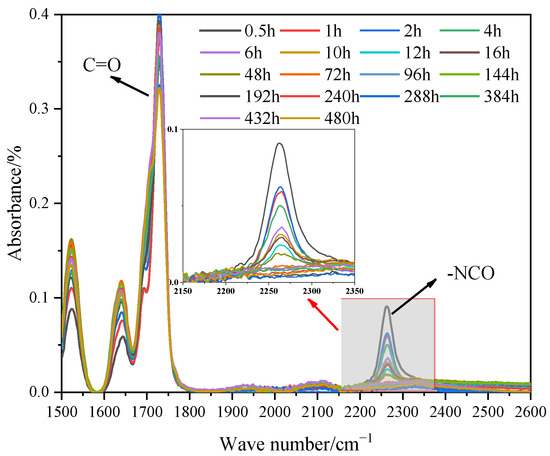 The FTIR test was used to monitor the chemical evolution of STR and, therefore, follow the curing reaction. As shown in Figure 4, in the curing process, the intensity of the characteristic peak (-NCO) ranging from 2181 to 2359 cm−1 gradually decreases and finally disappears, which indicates the completion of the curing reaction. In contrast, the intensity of the characteristic peak (C=O) ranging from 1667 to 1795 cm−1 remains nearly unaffected throughout the polymerization process. Based on the Lambert-Beer principle, the area of a specified absorbance peak is proportional to the concentration of the corresponding chemical composition. However, according to the existing study [39], the intensity of an absorbance peak is highly dependent on the sample thickness. To eliminate such interference, the absorbance peak of C=O is selected as the reference peak, and the normalized absorbance index (AI) of the -NCO peak is defined in Equation (1). Hence, the conversion of the -NCO peak or curing degree α can be calculated using Equation (2).