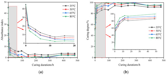 According to Equation (2), the absorbance index and curing degree of STR at varying curing temperatures can be calculated and are shown in Figure 5a,b.