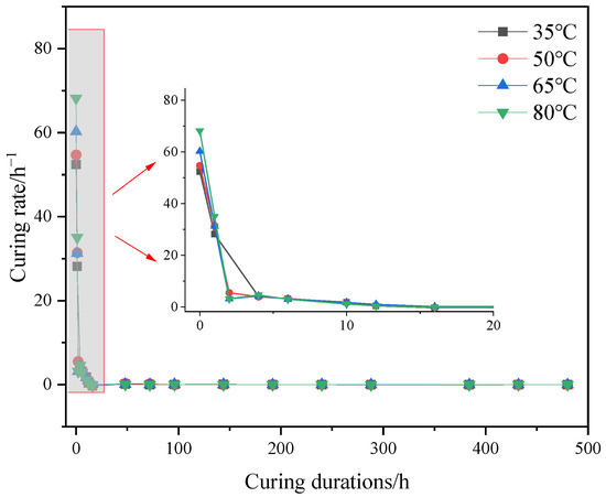 According to Figure 5, significant effects of curing temperature on the curing reaction can be observed. Generally, increased curing temperatures are beneficial to enhancing the curing rate and consequently increasing the curing degree. As revealed in Figure 5b, with the same curing durations, the curing degrees of STR at 80 °C are always the highest, followed by that of STR at 65 and 50 °C. In contrast, the curing degree of STR at 35 °C is the lowest. For instance, it takes 10 h for STR cured at 35 °C to reach an 80% curing degree. However, when cured at 80 °C, it takes 6 h to reach a curing degree of 80%. Furthermore, even when cured for 480 h, the curing degree of STR can hardly reach 100%, especially at low curing temperatures. When cured at 35 °C, the ultimate curing degree is lower than 95%. In contrast, when cured at 65 and 80 °C, the final curing degree approaches 100%. Hence, increased curing temperatures could promote chemical conversion and increase the ultimate curing degree.