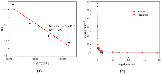According to Table 3, both the reaction rate constant k and reaction order n vary at different temperatures, especially for k. The results indicate that increased curing temperatures can enhance the reaction rate constant k. The data further explain the aforementioned results whereby at high curing temperatures, the curing degree is higher than that of STR at low curing temperatures. As shown in Equation (6), the reaction rate constant k correlates with the curing temperature and follows the Arrhenius law. Equation (6) can be rewritten into Equation (7). As shown in Equation (7), lnk and 1/T demonstrate a linear relationship. Hence, linear fitting was conducted based on Table 3. The results are shown in Figure 7a.
