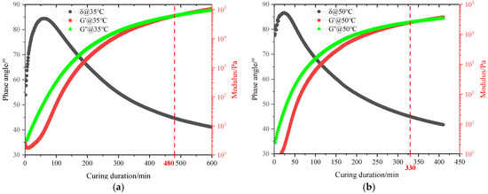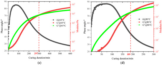 As revealed in Figure 8, with the prolonging of curing duration, the storage modulus and loss modulus both demonstrate significantly increased trends regardless of the curing temperature, which is attributed to the proceeding of the curing reaction. At the beginning of the curing process, the loss modulus is always higher than the storage modulus. Therefore, the stress–strain response is mainly dominated by the viscous properties initially. After the gel point time, the storage modulus is higher than the loss modulus, which indicates the transformation of STR from a viscous liquid to a viscoelastic solid. In addition, during the curing process, an induction period can be observed in storage modulus evolution. The increment rate of the storage modulus starts roughly at 0, and then, reaches the maximum according to the slope of the storage modulus evolution curve.