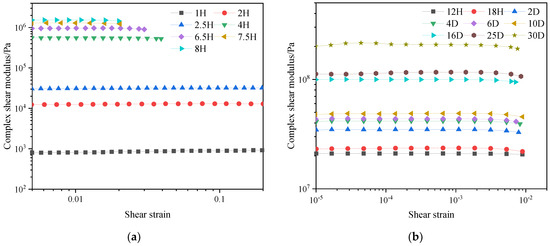 The specimens for the LVE region test were cured at 50 °C for different durations from 1 to 720 h. The LVE region test was conducted at 25 °C, and the loading strain varied from 0.001% to 2% or 0.1% to 20% depending on the curing durations of the STR samples. The LVE region is determined as the strain at which the complex shear modulus reduces to 95% of the initial value [38]. The results of the LVE region test are summarized in Figure 9.