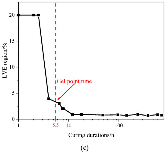 It is clear that, when cured for 10 h at 50 °C, the LVE region demonstrates a stable tendency and concentrates around 1%. After this, the increases in curing duration can hardly alter the LVE region. This phenomenon means that after 10 h of curing process, a thermosetting three-dimensional network is basically formed, and the movement of branched chains is confined. According to the previous section, the gel point time at 50 °C is about 5.5 h. Based on Figure 9c, it should be noted that the inflection point of LVE region evolution seems to be near the gel point. This interesting finding may further confirm the definition of the gel point and the apparent rheological property evolution at this point.