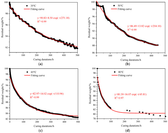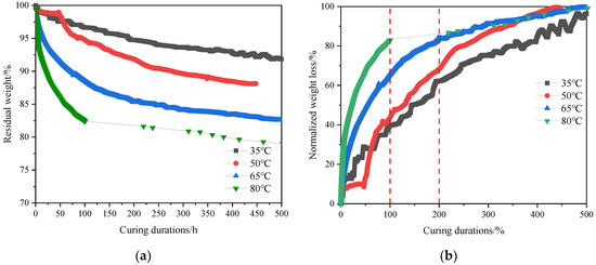 As revealed in Figure 10a, with the prolonging of curing durations, the weight of the reactant demonstrates a significantly decreasing trend, especially for the specimens cured at higher temperatures. The observed weight loss of STR may be attributed to the reaction-induced volatilization of the curing agent. Specifically, after being cured for 400 h, the weight loss of the specimen cured at 35 °C is about 8%; in contrast, when cured at 80 °C, the weight loss approaches 20%. These results indicate that the elevated curing temperatures may boost the curing reaction rate and increase the evaporation of the reactant.