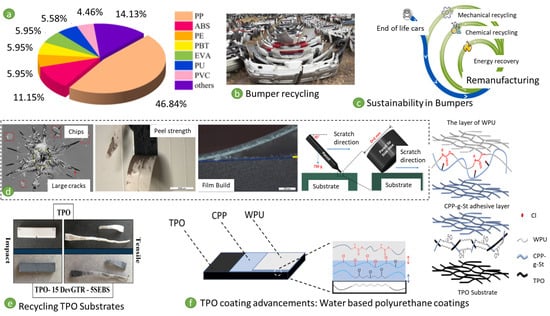 Extracts from technological advancements in TPO substrates and coatings [3,18,19,23,26]. (a) Different substrates used in automotive parts; (b) image of waste bumper collection for recycling, (c) different recycling routes for vehicle parts [27]; (d) images of stone-chip resistance, peel strength tests with microscopy images, and pencil hardness tests [23]; (e) recycled rubber parts with incorporated TPO substrates [28]; and (f) illustration of novel water-based polyurethane coatings for TPO substrates [18].