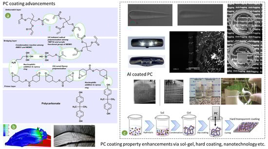 Extracts from technological advancements in PC-substrate-based coating and properties. (a) Illustration of three-layer concept of a hard coating for PC consisting of epoxy primer layer, aminosiloxanes as bridging layer, and an acrylic UV-cured anti-scratch layer [68,72], (b) modeling and simulation technique for better sideview mirror coating application [73], and (c) different sol–gel-based PC coatings showing better anti-glare, anti-scratch, and anti-fog properties with good cross-cut adhesion [56,58].