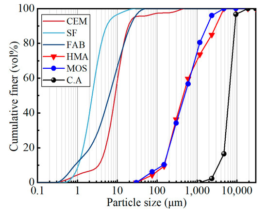 P·ΙΙ 52.5 silicate cement (CEM) was used for cement, with an apparent density of 3.15 g/cm3. The specific surface area of silica fume (SF) was 18,300 m2/kg, and the SiO2 content was 90%. The fly ash microsphere (FAM) 28 d activity index was 113%. The expansion agent was CaO–MgO compound. HMA and MOS were selected as fine aggregates. HMA had an apparent density of 2530 kg/m3 and a saturated surface dry water absorption rate of 6.8%, whereas MOS had an apparent density of 3100 kg/m3 and a saturated surface dry water absorption rate of 10%. The chemical compositions of HMA and MOS are listed in Table 1. The coarse aggregate (C.A) was basalt crushed stone with a particle size of 5–8 mm, crushing value of 12%, and apparent density of 2900 kg/m3, and the particle size distribution curve is shown in Figure 1. The superplasticizer is polycarboxylic acid high-performance superplasticizer agent with 40% solid content and 35% water reduction rate. Short straight steel fibers were used to enhance bending toughness with an equivalent diameter of 0.2 mm, a nominal length of 13 mm, and a density of 7850 kg/m3.