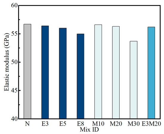 The elastic modulus of high-modulus UHPC is shown in Figure 6. It can be clearly seen that the elastic modulus of the prepared UHPC was higher than 50 GPa, which is mainly due to the use of high-elastic modulus aggregate basalt and HMA. The elastic modulus of UHPC would be reduced by either the inclusion of an EA alone or the ICA. On the one hand, the expansion reaction of the EA affected the hydration degree of the slurry, which also made the internal structure of UHPC looser. Therefore, as the amount of expansion agent dosing increased (while dosing alone), the more noticeable the decrease was in the modulus of elasticity of UHPC. On the other hand, the internal curing effect of MOS was hardly enough to counteract the decreasing effect of the increase in the actual water–cement ratio of UHPC and the decrease in the proportion of HMA dosing. As a result, the modulus of elasticity of the M30 group was significantly reduced. In addition, the insignificant decrease in the elastic modulus of the M10 and M20 groups was due to the fact that the porous and high-strength MOS could effectively improve the interfacial bonding properties of the matrix by means of internal curing.