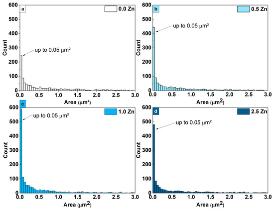 Pore area histogram of 0.0 Zn (a), 0.5 Zn (b), 1.0 Zn (c), and 2.5 Zn (d) samples.