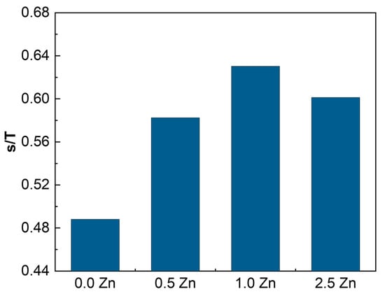 Histograms of the pore area produced on the surface of the samples are presented in Figure 2. The Zn variation was not enough to significantly change the pore size, and the largest number of pores had an area size of up to 0.05 μm2. With the data obtained by the histograms on the pore size of the coatings, it was possible to prepare the graph in Figure 3, which shows the relationship between the (s/T) ratio and the variation in the amount of Zn in the MAO electrolytic solution. The (s/T) ratio is calculated by dividing the number of smaller pores (up to 0.25 μm2) by the total number of measured pores. Thus, it was possible to better analyze the variation in the relative size of the pores produced on the samples’ surface, since the higher the s/T is, the smaller the pores are. The addition of Zn increased the s/T ratio. This means that the number of smaller pores increased compared to the total number of the measured pores. For the 1.0 Zn sample, the number of small pores was even higher. However, for the 2.5 Zn sample, this ratio was again similar than that of the 0.5 Zn sample.