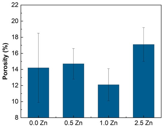 Figure 4 shows the porosity of the samples oxidized by MAO. The porosity of the 0.5 Zn sample does not suffer much variation with respect to the 0.0 Zn sample (p > 0.05) due to the low concentration of Zn. Considering the samples with Zn, the porosity varies inversely to the s/T variation, since when the pores are larger (s/T smaller), the area occupied by the pores increased. The decrease in the pores’ relative size and, consequently, the significant decrease (p < 0.05) in the porosity of the 1.0 Zn sample may be related to the closing of the pores due to particles accumulating on the sample’s surface [40], as can be seen in Figure 1. However, the porosity increased significantly again (p < 0.001) in the 2.5 Zn sample, despite the pores closing due to the increase in the number of metallic ions in the electrolyte solution, which raised the conductivity of the medium and, consequently, increased the energy during oxidation. As a result, the quantity and size of the bubbles produced in the liquid increased, forming a surface with higher porosity [43].