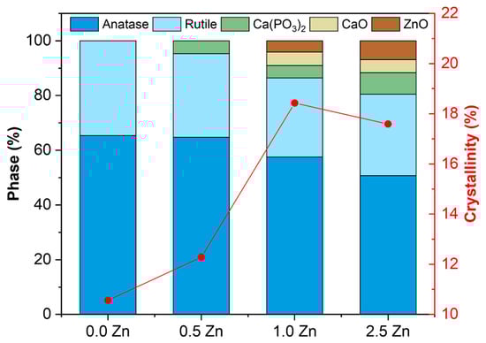 From the XRD data, the amount of oxide phase and surface crystallinity variation was calculated, and the results are shown in Figure 6. It is known that the activation energy required for the TiO2 anatase phase is significantly lower than that for the rutile phase [45]. Thus, it was observed that with the increase of Zn in the electrolyte, which gradually increased the energy of the MAO process, the amount of anatase phase decreased, while other phases, which require more energy for formation, increased. The research conducted by Zhang et al. modified the energy of the MAO treatment by changing the electrolyte composition [46] and varying the applied current density [41]. In both cases, with increasing the energy involved in the process, the TiO2 rutile phase increased, while the anatase phase decreased. Due to the high temperatures in the coating production process and very high cooling rate [47,48,49], the produced surface was characterized by low crystallinity, ranging between 10.6 and 18.4%. Other studies have also shown the low crystallinity of MAO coatings [50,51,52]. Komarova et al. [4] demonstrated that adding Zn caused a slight increase in the crystallinity of the coating produced on the Ti-40Nb alloy, although the coating was mainly amorphous. Kuroda et al. [13] studied the effect of thermal treatments on MAO coatings and observed that, even at high temperatures (800 °C), the coating remained amorphous.