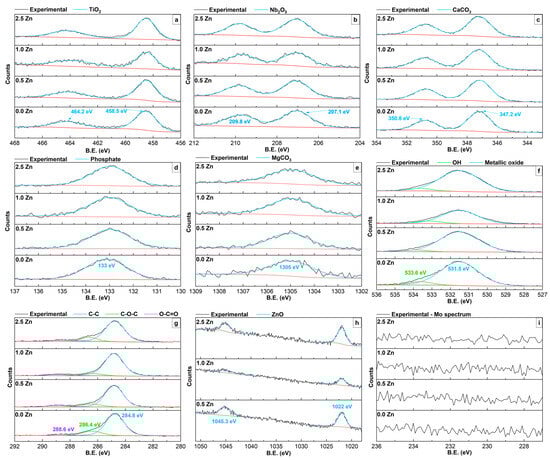High-resolution XPS of the alloying elements (Ti (a), Nb (b), and Mo (i)) and Ca (c), P (d), Mg (e), O (f), C (g), and Zn (h) in the outer layer of the samples. The red lines are the background lines.