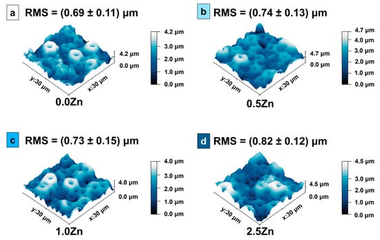 The AFM images and the surface roughness of the samples are shown in Figure 8. The average roughness tends to increase with the addition of Zn in the electrolyte. This is a consequence of the gradual increase in the energy of the MAO process, due to the increase in the number of ions in the electrolytic solution [43]. The same trend of increased roughness with increasing amounts of Zn was observed by Zhang et al. [10]. However, the values obtained in [10] are higher than those obtained in the present study with the Ti-30Nb-5Mo alloy. Another indication is that the energy of the MAO process for this alloy is relatively smaller, corroborating the SEM results (accumulation of particles on the surface) and the chemical composition determined by XPS (low Zn concentration).