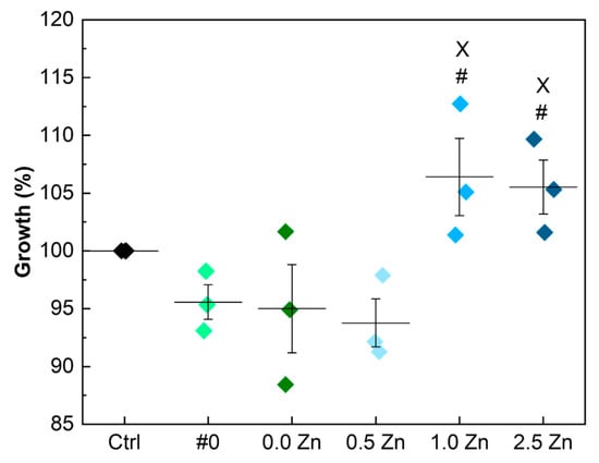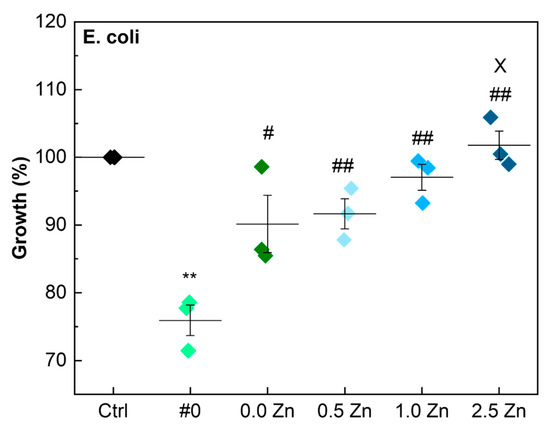 Concerning the E. coli bacteria control, only the substrate (#0) had significantly lower bacterial growth. With the MAO treatment and, subsequently, with the addition of Zn, the growth of E. coli increased as the Zn concentration increased, reaching values very close to the control.