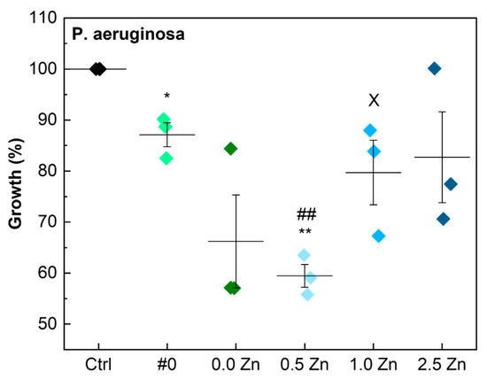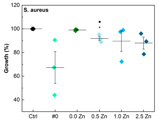 Only the 0.5 Zn sample had a significantly lower growth of S. aureus bacteria strain than the control, although it is possible to observe an apparent downward trend in this bacteria growth rate as the Zn concentration increased. However, the variation in Zn levels was insufficient to observe a greater interference with the results for the S. aureus.