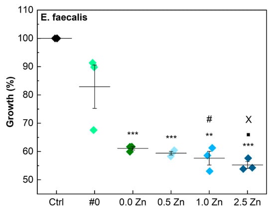 E. faecalis growth on theTi-30Nb-5Mo alloy substrate and on the MAO coatings (** p < 0.01, *** p < 0.001, compared with Ctrl group; # p < 0.05, compared with #0 group; ■ p < 0.05, compared with 0.0 Zn group; X p < 0.05, compared with 0.5 Zn group).