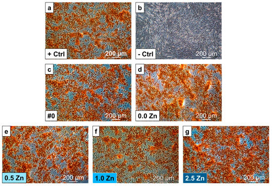 Alizarin Red S staining of AMSCs differentiated in vitro into the osteogenic lineage for positive control (a), negative control (b), substrate (c), and 0.0 Zn (d), 0.5 Zn (e), 1.0 Zn (f), and 2.5 Zn (g) MAO coatings.