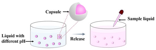 Simulated experiments to test the controlled release characteristics of the capsules at different pH were performed as shown in Figure 2. In detail, the preparation of the mm-CaSA-Caps with an aqueous core containing red dye was performed as written in Section 2.2. An amount of 2.5 g∙L−1 Reactive Red X-3B was added to the SA solution. The PECA@CaSA-Caps were prepared as written in Section 2.3 with 6 mL ECA in trichloromethane and a reaction time of 60 min. Then 20 of the prepared capsules were randomly selected and their surface water was wiped with filter paper. Then the capsules were added to 500 mL of liquid under magnetic stirring. An amount of 5 mL of sample liquid was taken in a cuvette every 5 min, and the absorbance of the sample liquid was measured with a UV-Vis spectrophotometer (756PC, Tianjin Tuopu Instrument Co., Ltd., Tianjin, China) at 540 nm (the maximum wavelength of absorption of the Reactive Red X-3B). Three kinds of liquid, deionized water, 0.1 mol·L−1 HCl and 0.0001 mol·L−1 NaOH, were used, the pH of which were 7.0, 1.0 and 10.0, respectively. The concentration of the liquid containing the Reactive Red X-3B (c) was calculated according to Equation (3).