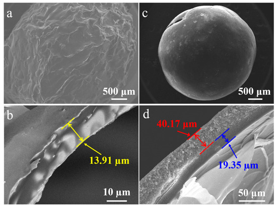 Figure 3 demonstrates the morphology of mm-CaSA-Caps and PECA@CaSA-Caps. After vacuum freeze-drying, the mm-CaSA-Caps present a wrinkled surface ascribed to freezing and expanding in the cold, then thawing and shrinking (Figure 3a). The thickness of the membrane of the mm-CaSA-Caps is 13.91 μm (Figure 3b). After coating with PECA, the structure of the PECA@CaSA-Caps is stable and remains spherical during vacuum freeze-drying (Figure 3c). In Figure 3d, the PECA layer which covers the membrane of the mm-CaSA-Caps tightly is 40.17 μm. The thickness of the membrane of the mm-CaSA-Caps in Figure 3d is 19.35 μm, which is thicker than that in Figure 3b, because the inner CaSA layer protected by the PECA coating is unexpanded.