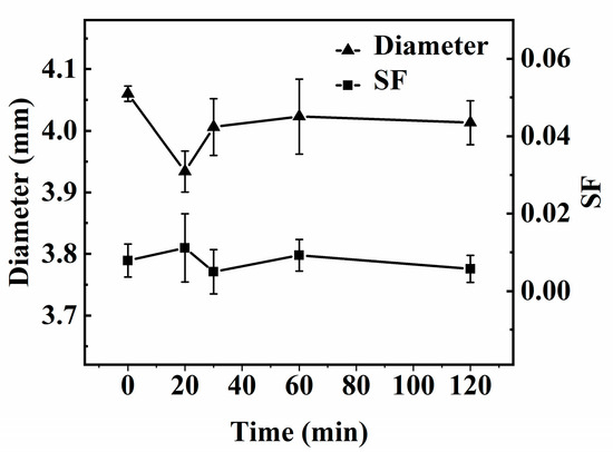 The diameter of the capsule is shown in Figure 4. The diameter of the mm-CaSA-Caps is 4.06 mm. When the interfacial polymerization occurs, the diameter of the PECA@CaSA-Caps decreases to 3.93 mm at 20 min, then increases gradually to 4.02 mm at 60 min. The diameter of the PECA@CaSA-Caps is 4.01 mm at 120 mm, which is still lower than the diameter of the mm-CaSA-Caps. Since the ECA monomer dissolved in trichloromethane undergoing the anionic polymerization reaction was initialized by the water in the surface of mm-CaSA-Caps, part of the bond water diffuses outward from the membrane of mm-CaSA-Caps. Then the mm-CaSA-Caps undergo a certain degree of shrinkage in volume, leading to a reduction in the diameter of the capsule. With the increase in reaction time, the diameter of the capsule increases, because the PECA coating grows constantly on the surface of mm-CaSA-Caps. The sphericity of the capsule is also shown in Figure 4. The SF value of the mm-CaSA-Caps is 0.008. The SF values of PECA@CaSA-Caps that are between 0.005 and 0.011 are also much less than 0.07. That is, under mild reaction conditions, the PECA@CaSA-Caps maintain an intact structure and a good spherical shape. It indicates that the rapid and mild coating process has no obvious effect on the sphericity of the capsule, which is consistent with the digital photos of the capsules in Table 1.