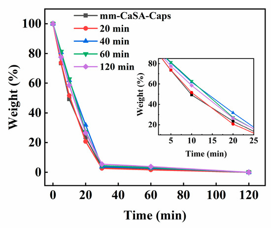 Figure 5 shows the change in water weight in the capsules tested at 60 °C. As the test time increases, the water weight ratio in all capsules decreases until it becomes zero at 120 min. At 10 min, the water weight ratio of mm-CaSA-Caps and PECA@CaSA-Caps prepared in 20 min, 40 min, 60 min and 120 min are 49.3%, 51.6%, 61.8%, 62.8% and 58.5%, respectively. Compared with the mm-CaSA-Caps, the water weight ratio of PECA@CaSA-Caps prepared in 20 min shows little difference. The water weight ratio of PECA@CaSA-Caps prepared in 40 min, 60 min and 120 min decreases by 12.5%, 13.5% and 9.2%, respectively. Since the Ca-SA membrane is a hydrophilic and semipermeable membrane, the mm-CaSA-Caps cannot effectively control the release of water. As the PECA coating forms on the mm-CaSA-Caps, it retards the permeation of water. When the reaction time is 20 min, the coated PECA layer on the surface of mm-CaSA-Caps is thin, which makes it difficult to achieve the ideal barrier effect. As the reaction time increases, anionic polymerization of the ECA constantly occurs on the surface of capsules, and the produced PECA coating becomes thicker; thus the permeation of water from the PECA@CaSA-Caps decreases. The water weight ratio of PECA@CaSA-Caps prepared in 40 min, 60 min and 120 min obviously increases. It indicates that the PECA coating can effectively improve the barrier property of mm-CaSA-Caps.