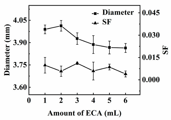 In Figure 7, the effect of the amount of ECA on the diameter and sphericity of PECA@CaSA-Caps is discussed. As the amount of ECA increases from 1 mL to 2 mL, the diameter of the PECA@CaSA-Caps increases slightly from 3.99 mm to 4.01 mm, then decreases gradually to 3.86 mm when the amount of ECA increases to 6 mL. On the one hand, the thickness of the PECA coating increases as the increase in the amount of ECA leads to a rise in the diameter of the PECA@CaSA-Caps. On the other hand, water on the surface and on the inside of the mm-CaSA-Caps diffuses outward and initiates the anionic polymerization of ECA monomers, resulting in the shrinkage of the mm-CaSA-Caps. The result is that the latter generally gets the upper hand. Finally, the diameter of the PECA@CaSA-Caps decreases with the increase in the amount of ECA. The SF of the PECA@CaSA-Caps prepared with different amounts of ECA are also demonstrated in Figure 7. The SF of PECA@CaSA-Caps is between 0.004 and 0.011, which is far below 0.07. That is to say, the PECA@CaSA-Caps keep good sphericity and the coating process has no obvious effect on the sphericity of the capsules, which is consistent with the photos in Table 2.