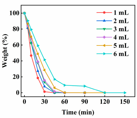 Figure 8 shows the effect of the amount of ECA on the weight change of water in the PECA@CaSA-Caps. As the amount of ECA increases, the weight loss ratio of water in the PECA@CaSA-Caps decreases. At 30 min, the weights of the water in the PECA@CaSA-Caps are 1.28%, 7.93%, 13.57%, 15.65%, 28.4% and 41.5%, respectively, when the amounts of ECA are 1 mL, 2 mL, 3 mL, 4 mL, 5 mL and 6 mL. The reason is that the larger the amount of ECA, the thicker the PECA layer that forms, resulting in its stronger ability to block the permeation of water. When the amount of ECA is 6 mL, the water in PECA@CaSA-Caps releases completely within 120 min, which is nearly three times the releasing time of PECA@CaSA-Caps prepared with 1 mL ECA. In general, the PECA@CaSA-Caps can be successfully prepared with different amounts of ECA. The prepared capsules have good sphericity. When the amount of ECA is 6 mL, the PECA@CaSA-Caps have the best water retention performance.