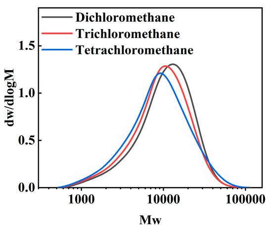 The GPC diagram of the PECA shells of PECA@CaSA-Caps prepared in different chloromethane solvents.