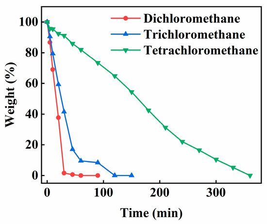 Figure 11 shows the weight change of water in the PECA@CaSA-Caps prepared in different chloromethane solvents. The water loss ratio of the PECA@CaSA-Caps decreases in the order of dichloromethane, trichloromethane and tetrachloromethane. The dehydration times of the PECA@CaSA-Caps prepared in dichloromethane, trichloromethane and tetrachloromethane are 60 min, 120 min and 360 min. Based on the SEM images in Figure 8, the PECA@CaSA-Caps prepared in dichloromethane and trichloromethane have porous structures caused by irregular flaky PECA stacking. And the thickness of the PECA coating formed in trichloromethane is higher than that formed in dichloromethane. Compared with the lamellar porous structure, the continuous non-porous structure of the PECA@CaSA-Caps prepared in tetrachloromethane can effectively reduce the evaporation of water in the core of the capsules [22], leading to the excellent water barrier performance of the PECA@CaSA-Caps. In general, the PECA@CaSA-Caps prepared in the three chloromethane solvents have a uniform diameter and good sphericity. The PECA@CaSA-Caps prepared in tetrachloromethane have the best water barrier performance and storage stability, which extends the application of hydrogel capsules [27].