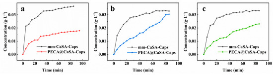 In order to verify the effect of PECA coating on the PECA@CaSA-Caps, the controlled release properties of the prepared capsules at different pH conditions were investigated. As shown in Figure 12, the sudden release of dye released from the mm-CaSA-Caps occurs at the beginning in acidic (pH 1.0) (Figure 12a), neutral (pH 7.0) (Figure 12b) and alkaline (pH 10.0) (Figure 12c) environments. At 30 min, the concentrations of dye released from the mm-CaSA-Caps are 0.031 g·L−1, 0.028 g∙L−1 and 0.029 g∙L−1 in the acidic (pH 1.0), neutral (pH 7.0) and alkaline (pH 10.0) environments, respectively. The release rates of the dye released from the mm-CaSA-Caps increase in order the of neutral (pH 7.0), alkaline (pH 10.0) and acidic (pH 1.0) conditions. Because the mm-CaSA-Caps are pH sensitive, they swell in acidic gastric solution (pH 2.0) but degrade in alkaline intestinal solution (pH 7.5) [1]. However, the release rates of dye released from the PECA@CaSA-Caps decrease dramatically compared with those of the mm-CaSA-Caps under the three pH conditions. There is no sudden release phenomenon of the PECA@CaSA-Caps under the three pH conditions. At 30 min, the concentrations of dye released from the PECA@CaSA-Caps are 0.014 g∙L−1, 0.013 g∙L−1 and 0.012 g∙L−1 in the acidic (pH 1.0) (Figure 12a), neutral (pH 7.0) (Figure 12b) and alkaline (pH 10.0) (Figure 12c) environments, respectively. At 60 min, the concentrations of dye released from the PECA@CaSA-Caps are 0.016 g∙L−1, 0.022 g∙L−1 and 0.019 g∙L−1 in the acidic (pH 1.0), neutral (pH 7.0) and alkaline (pH 10.0) environments, respectively. The release rates of dye released from the PECA@CaSA-Caps are faster later in the neutral (pH 7.0) and alkaline (pH 10.0) environments than in the acidic (pH 1.0) environment. It is indicated that the PECA coating has a good barrier effect which can delay the release rates of the dye in the PECA@CaSA-Caps in neutral (pH 7.0), alkaline (pH 10.0) and acidic (pH 1.0) conditions and achieves the effect of controlled release according to pH.
