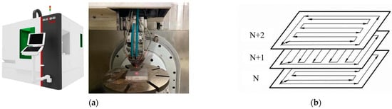 (a) AM equipment and laser deposition nozzle; (b) laser scanning path.
