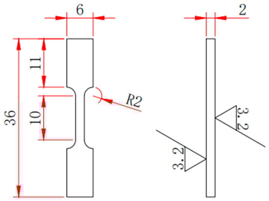 The phase composition was determined via X-ray diffraction (XRD) on a high-resolution X-ray diffraction (SmartLab 9 KW, Rigaku, Tokyo, Japan). The microstructure of the HEA was observed on the field emission scanning electron microscope (QUANT 250, FEI, Eindhoven, The Netherlands) with an energy dispersion spectroscope (Noran System 7, ThermoFisher Scientific, Walthamm, MA, USA). The grain morphology was observed by metallographic microscope (Ario Imager. M2m, OK, Berlin, Germany). The microhardness was measured by vickers microhardness tester (Wilson VH1202, Fort Worth, TX, USA). Yield strength and elongation were tested with a 1 mm/min tensile rate by the universal testing machine (CMT5105, MTS, Minneapolis, MS, USA). The specimens were sectioned using wire-electrode cutting in a direction perpendicular to the deposition direction. Their dimensions are shown in Figure 3. Finally, the tensile fracture morphologies of the specimens were analyzed.