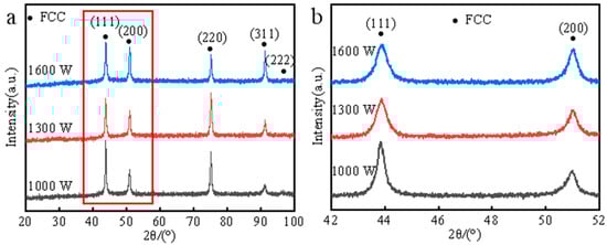 XRD patterns of AMed CoCrFeNi high entropy alloy at different laser powers: (a) complete spectra and (b) magnification of the peaks in the red box in (a).