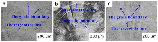 Optical micrographs of AMed CoCrFeNi HEAs at different laser powers: (a) 1000 W; (b) 1300 W; and (c) 1600 W.